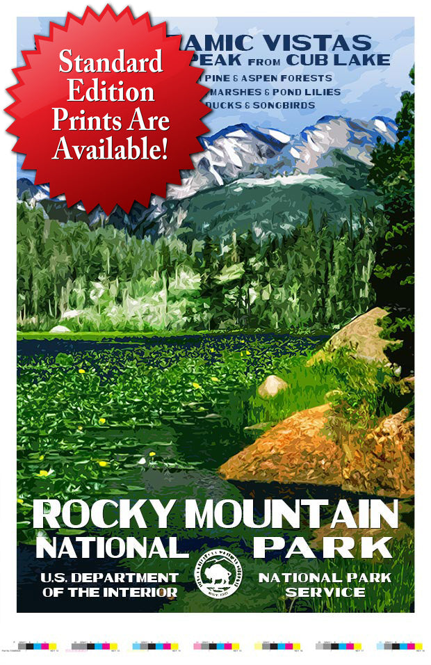 The Rocky Mountain National Park Artist Proof is a true limited edition, and only the first 25 prints pulled from this press run are available. I personally inspect these proofs on press and sign off on them before the balance of the posters are printed. The Artist Proofs feature the pressman’s “color bars”, which he uses to ensure that prints stay registered and colors stay consistent throughout the press run. Artist Proofs are numbered 1-25, dated and signed. My signature attests that I have personally inspected and approved each print — and further verified that no unsigned or unnumbered copies within the limited edition are known to exist.